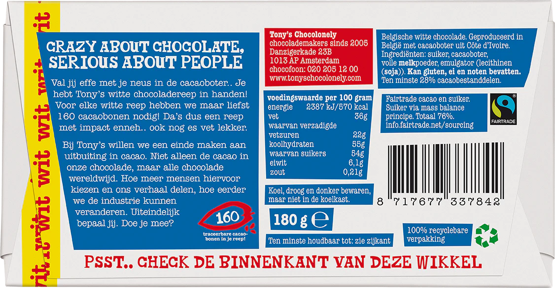 Deze witte chocolade reep is gemaakt met traceerbare cacaoboter van onze partnercoöperaties, en dat was best ingewikkeld. Het duurde dus effetjes voordat Tony’s z’n eigen ‘obroni’(dat is ‘witte’in het Ghanees) had! Maar deze witte rakker is ook onze lievelingssmaak, dus bestel ’m snel voordat we alles zelf opeten!